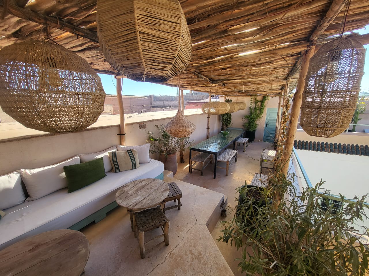 It is located in the heart of Marrakech Medina, a peaceful retreat just a short walk from the bustle of Jemaa el Fna. The roof terrace is designed for pure relaxation – with a solarium, dining area, heated pool, and wonderful views of the Atlas Mountains.