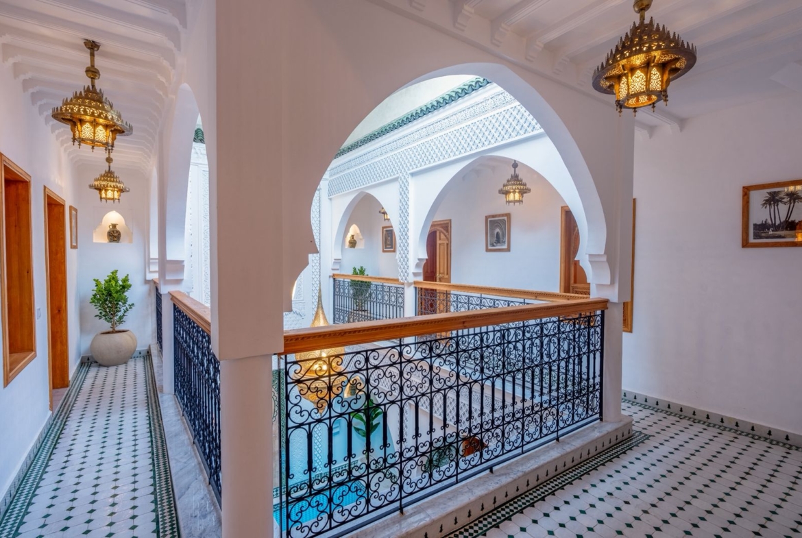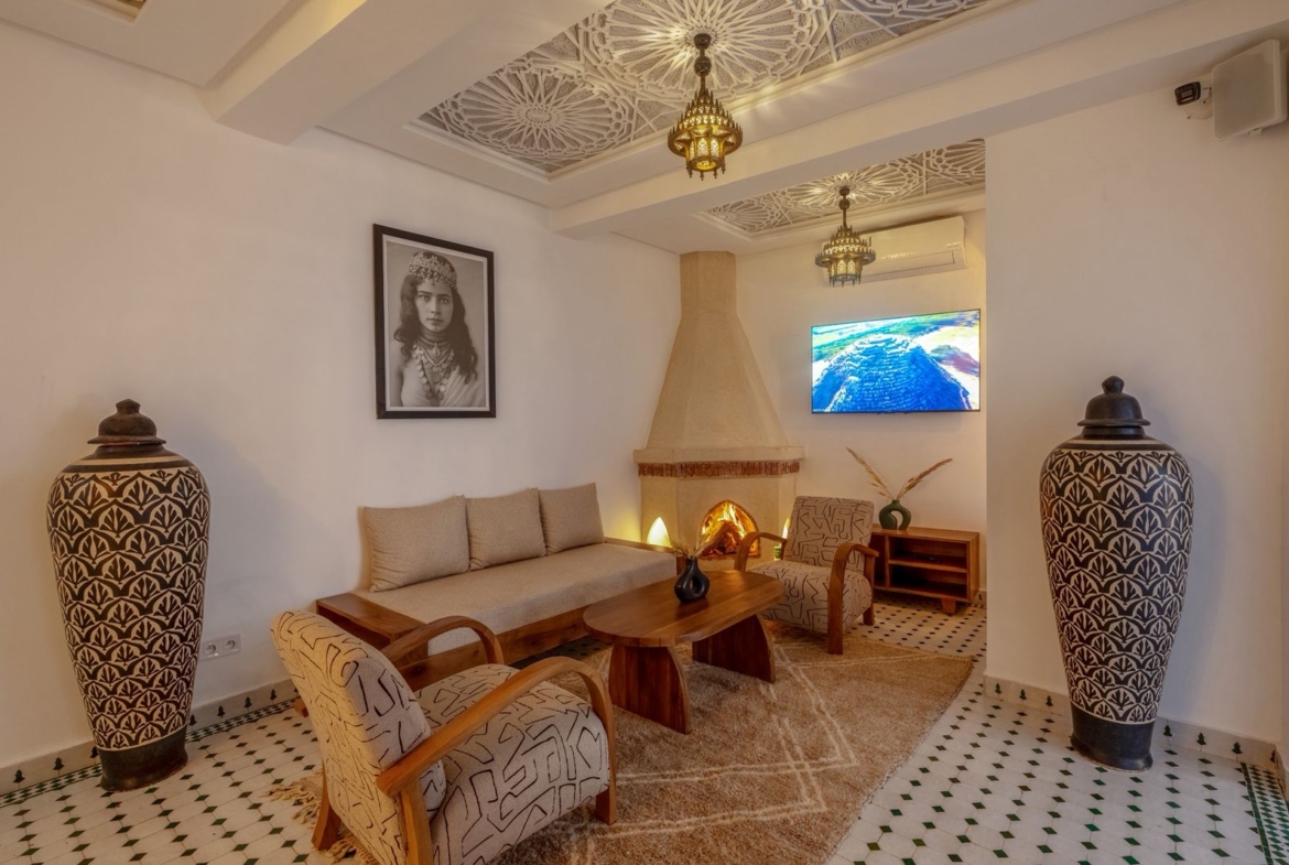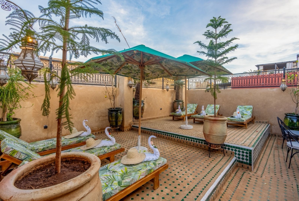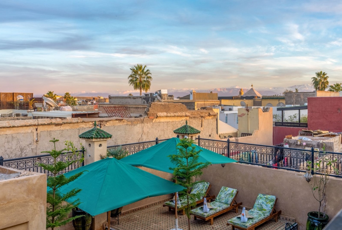 Guesthouse Riad For Sale in Marrakech. This beautifully finished 160m2 Riad is a licensed Maison D’Hotes generating excellent revenue. Located in Sidi Ben Slimane, a blossoming area with easy pedestrian access to all the historic landmarks and souqs of the Medina, it is an excellent key-in-hand investment for anyone looking to launch a guesthouse business without delay. The Riad has five comfortable guest suites and fabulous common areas in which to relax or dine. The roof terraces offer exceptional views of the Atlas Mountains and plenty of space to soak up the Marrakech sunshine. Finishings throughout the Riad are of exceptionally high quality and traditional design.
