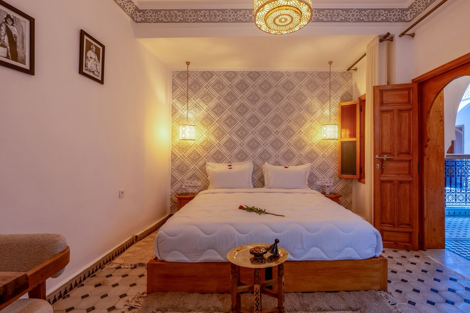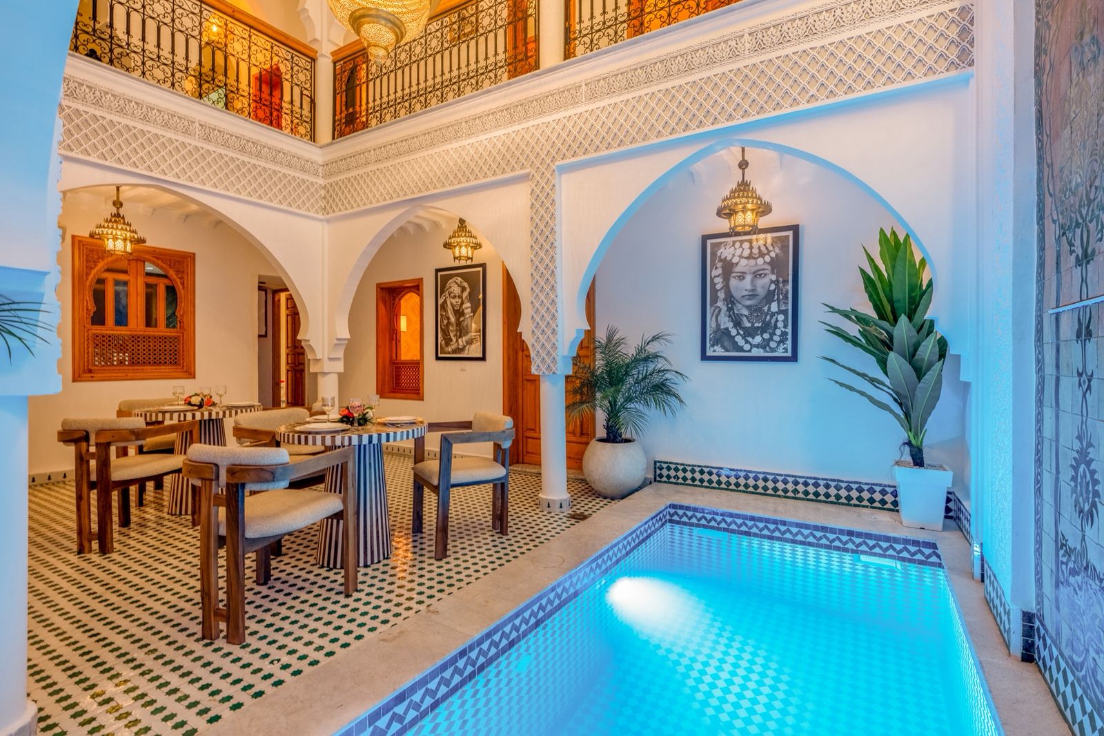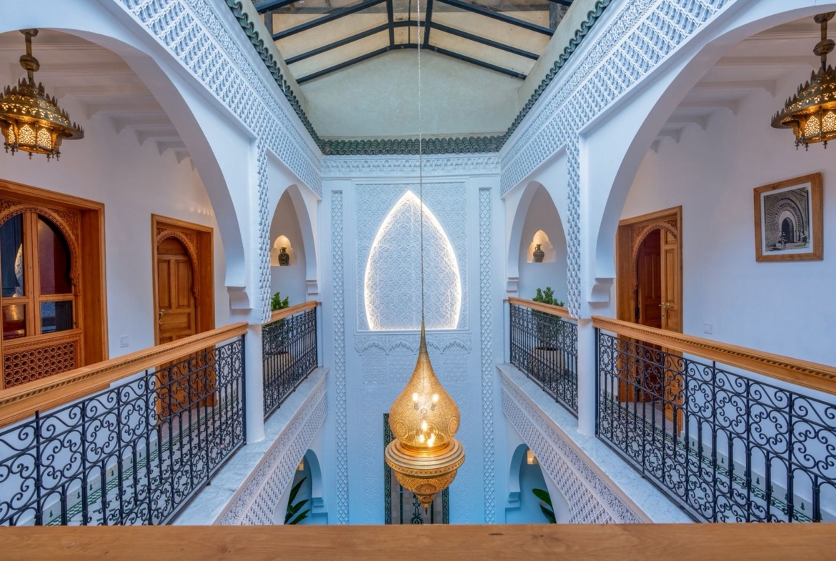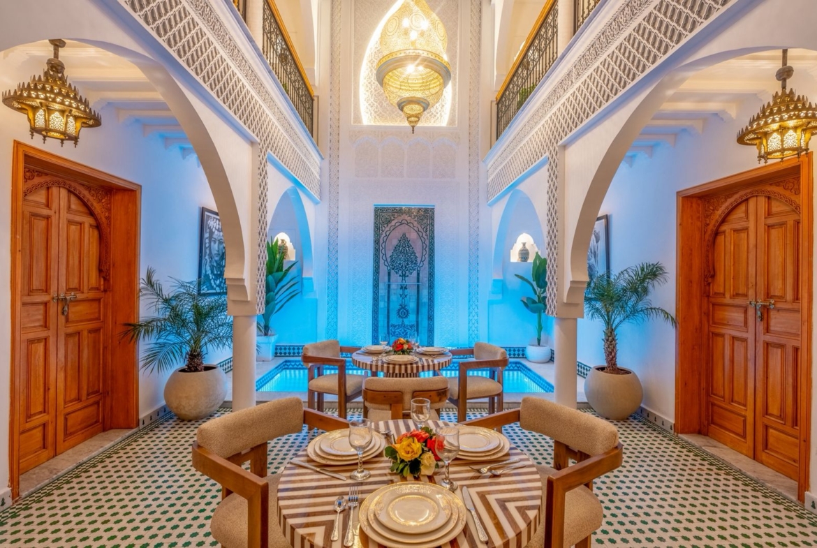 Guesthouse Riad For Sale in Marrakech. This beautifully finished 160m2 Riad is a licensed Maison D’Hotes generating excellent revenue. Located in Sidi Ben Slimane, a blossoming area with easy pedestrian access to all the historic landmarks and souqs of the Medina, it is an excellent key-in-hand investment for anyone looking to launch a guesthouse business without delay. The Riad has five comfortable guest suites and fabulous common areas in which to relax or dine. The roof terraces offer exceptional views of the Atlas Mountains and plenty of space to soak up the Marrakech sunshine. Finishings throughout the Riad are of exceptionally high quality and traditional design.